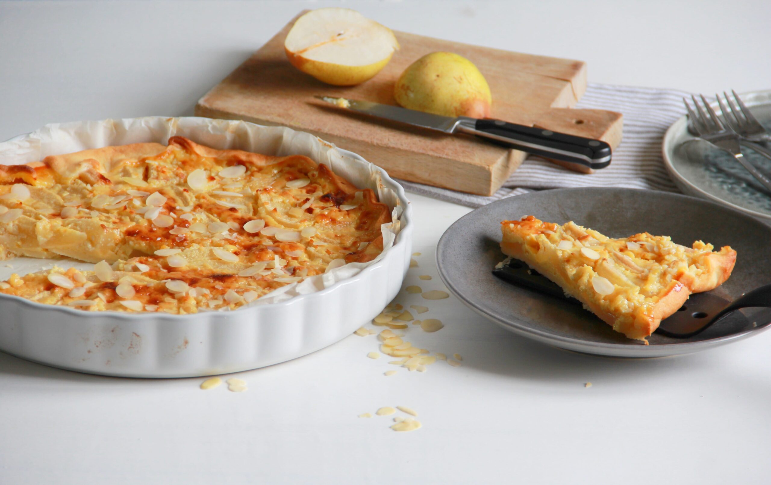 - Je fais cuire ma tarte à 200°C pendant 25 minutes. Quelques minutes avant la fin de la cuisson, j’ajoute 1/3 d’amandes effilées sur la tarte et je la laisse cuire jusqu’à ce que les amandes soient bien colorées.