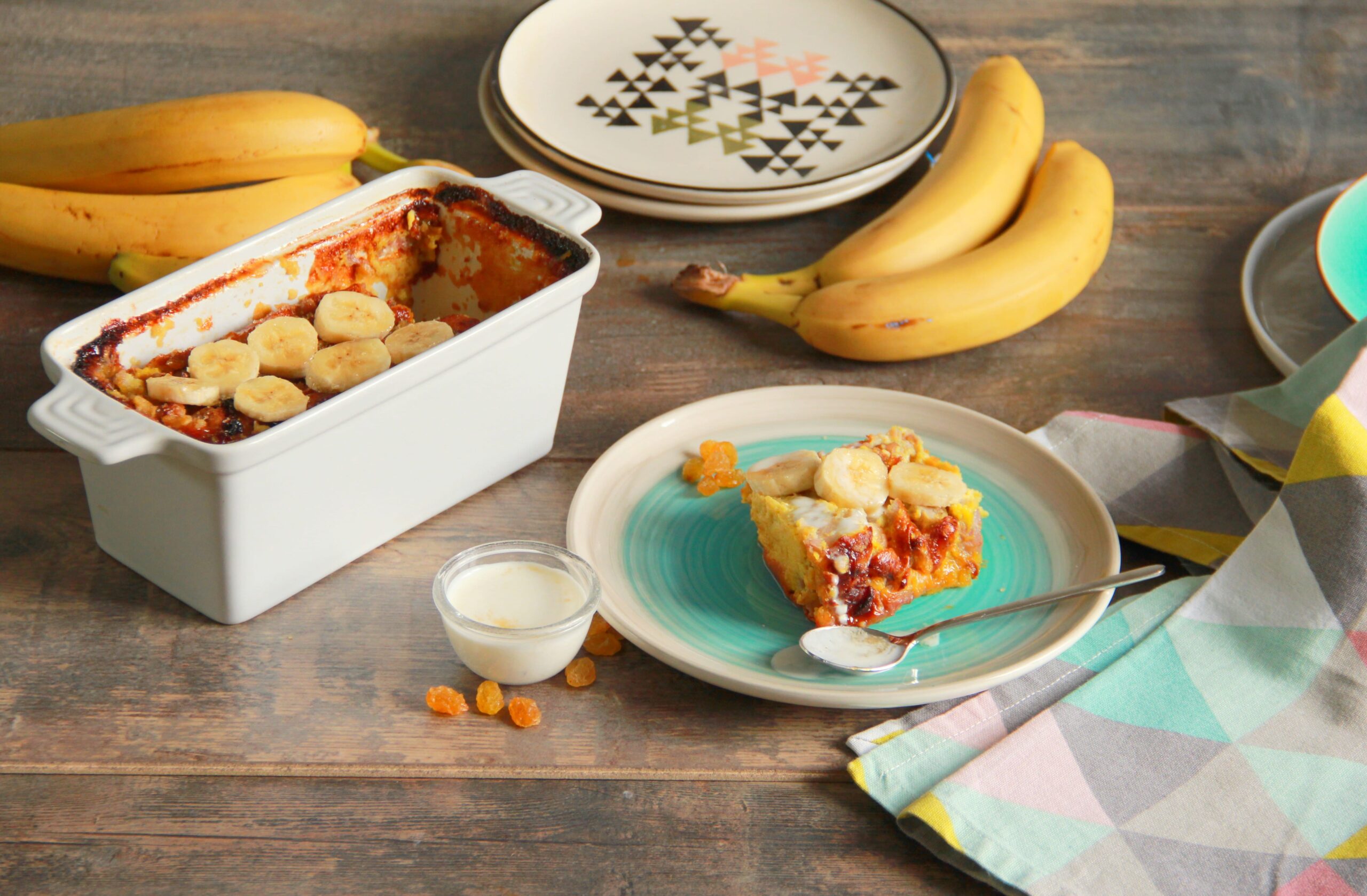 4. Je beurre et farine le moule. Je dépose le mélange bananes et raisin puis verse la pâte dessus.