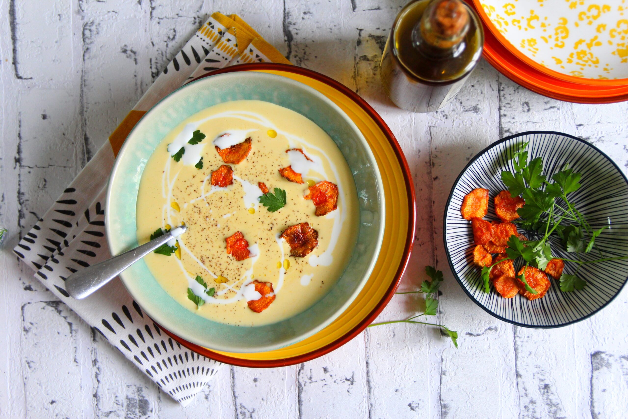 - Enfin, je dresse le velouté de maïs en assiette creuse, je dispose harmonieusement les chips de carottes égouttées sur du papier absorbant et je rajoute quelques brins de persil hachés.