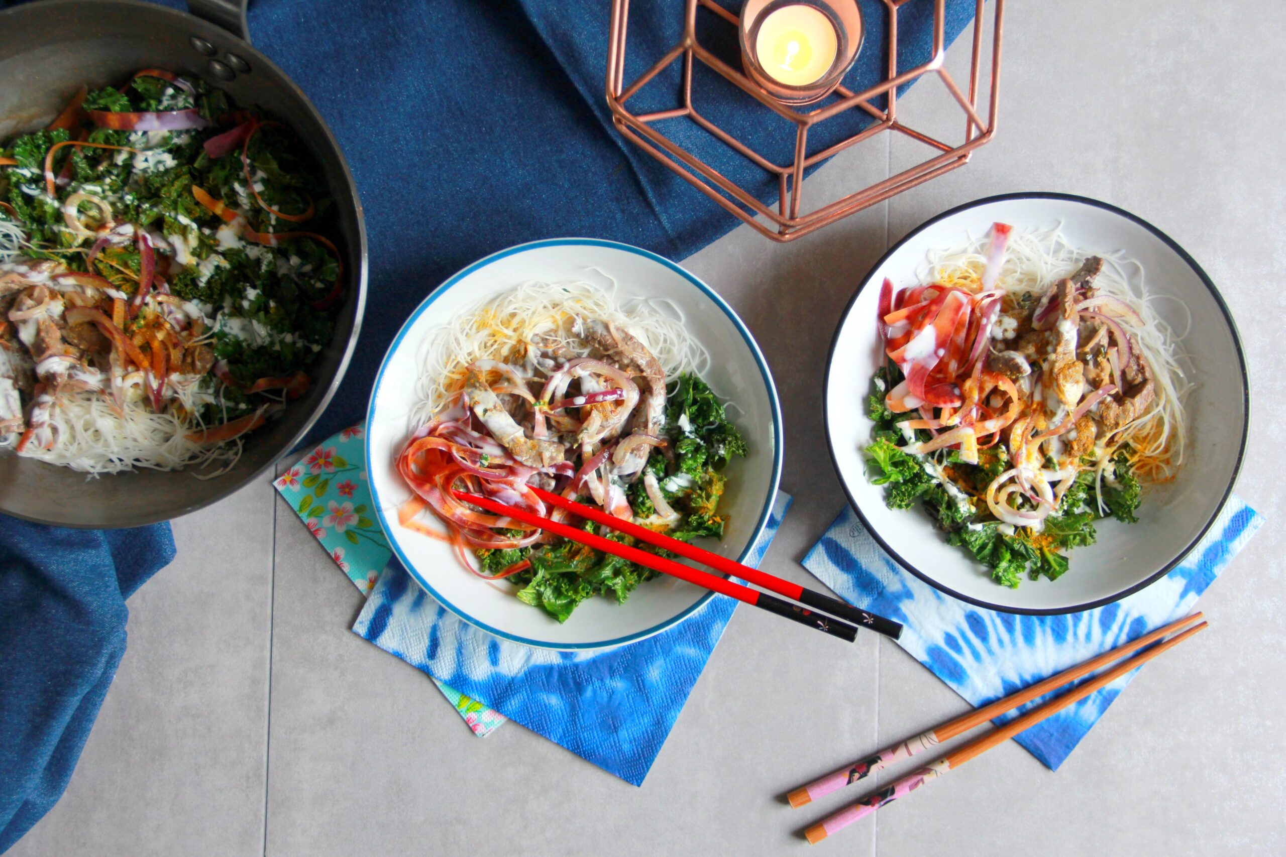 - Ensuite, j’ajoute les tagliatelles de carottes, les vermicelles de riz égouttés, la crème, je mélange bien et je laisse mijoter pendant 10 minutes.